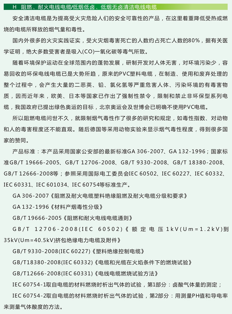 一、產品標準  本產品采用國家公安部的最新標準GA 306-2007、GA132-1996;國家標準GB/T 19666-2005、GB/T 12706-2008GB/T9330-2008、GB/T18380-2008GB/T 12666-2008等;參照采用國際電工委員會IEC60502、 IEC60227IEC60332、IEC60331、IEC601034IEC60754等標準生產。