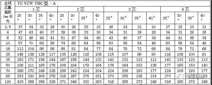 通用橡套軟電纜的載流量(450V/750V及以下橡膠絕緣電力電纜YQ、YQW、YHQ、YC、YCW、YHC型號的載流量